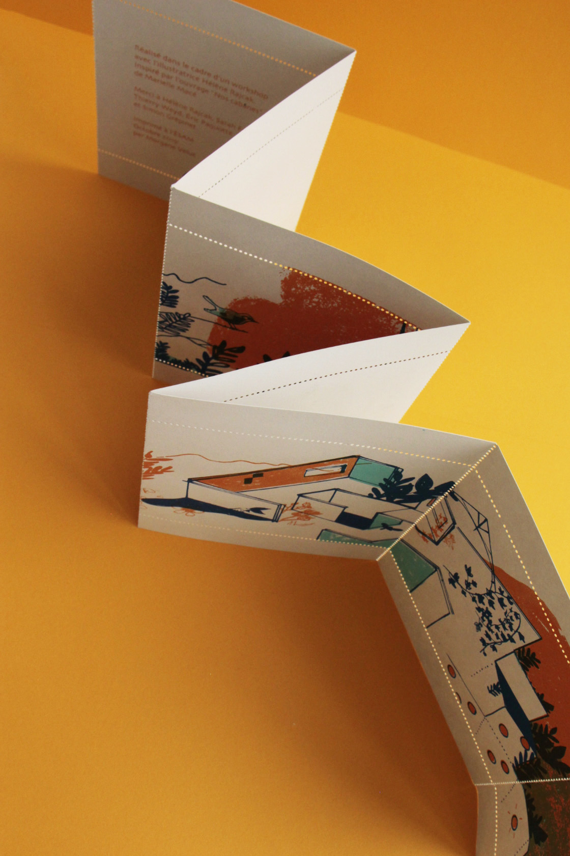 Édition réalisée dans le cadre du workshop avec l'illustratrice Hélène Rajcak. Inspiré du livre « Nos Cabanes » de Marielle Macé - 2019